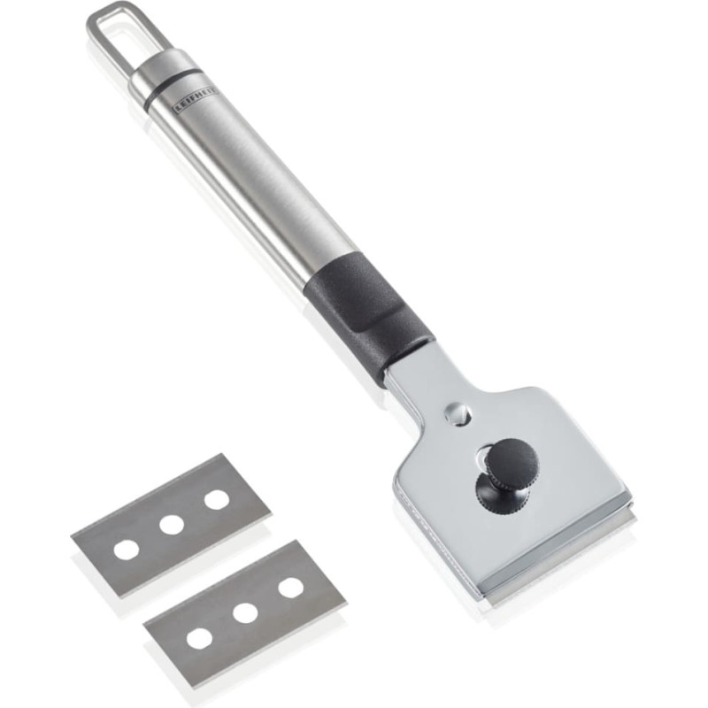 Leifheit plīts virsmas skrāpim ir trīs asmeņi, kas tiek glabāti skrāpja uzgalī, kā arī asmens aizsargs, lai novērstu traumas un priekšmetu skrāpējumus!