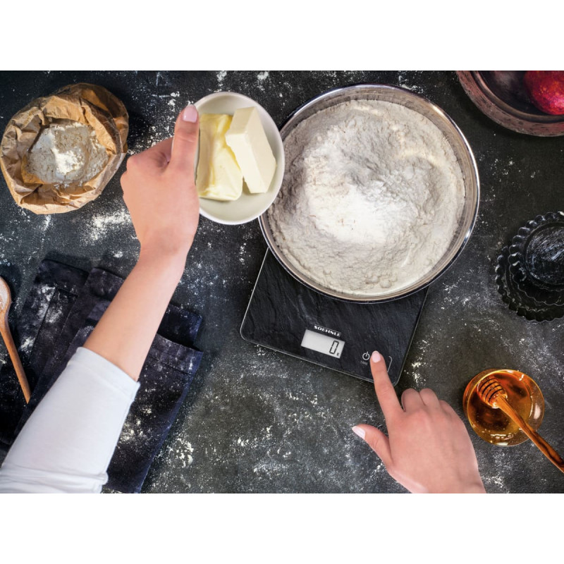 Šie virtuves svari būspareizā izvēle, ja jums nepieciešami ērti, kompakti, eleganta dizaina svari. Šī ierīce jūs pārsteigs , jo to kapacitāte ir 5kg, bet precizitāte ir 1g. Soehnle virtuves svaru 12mm LCD displejs nodrošina labi pārskatāmu un ērti nolasāmu mērījumu. Svariem ir arī tik ļoti ērtā TARA funkcija, kas nodrošina vairāku produktu vienlaicīgu svēršanu – pievieno vairākas sastāvdaļas, nomīnusojot iepriekš svērto. Tāpat akumulatora taupības nolūkos, svari ir aprīkoti ar automātisko izslēgšanos, kas tos padara par enerģiju taupošu ierīci. Dizainiski izstrādātais šīfera izskats un elegantā – plakanā svaru virsma, šos svarus padara par virtuves dekoru, kuru varat pat pakārt pie sienas kā dizaina elementu. Svaru virsma ir ļoti viegli kopjama, jo tajā nav iestrādātas nekādas pogas, tā ir ērta pateicoties sensorajai pieskārienu funkcijai. Svari ir aprīkoti arneslīdošām kājiņām, kas garantē to stabilitāti. Akumulatori ir iekļauti preces komplektācijā. Svaru kapacitāte: 5kg Svaru vienības(pārslēdzamas starp): g un oz / lb Akumulatori: 1 x 3 vCR2430 Izmērs: 20x15x1.3cm Garantija 5gadi
