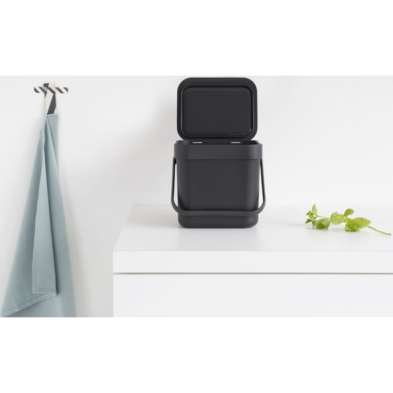 Šī jaukā 3 litru Brabantia Sort & Go atkritumu tvertne ar atvērtu vāku ir lieliski piemērota mizām, pārpalikumiem... faktiski visiem organiskajiem virtuves atkritumiem. Vienkārši novietojiet to uz darba virsmas, atvilktnē vai piekariet to pie sienas ar komplektā esošo stiprinājumu pie sienas. Atkritumu tvertne ir Pilna? Satveriet to aiz ērtā roktura un iztukšojiet to. PerfectFit 100% kompostējamie maisiņi ar kodu S ir ideāli piemēroti, un arī tos ir viegli ievietot! XXS izmērs.