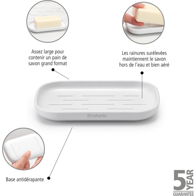 Brabantia ReNew ziepju trauks. Rievots, lai jūsu ziepes būtu sausas u ntās ir pietiekami lielas, lai ietilptu pilna izmēra ziepju dozatorā. Tai ir neslīdoša pamatne un stabila virsma, lai neslīdētu