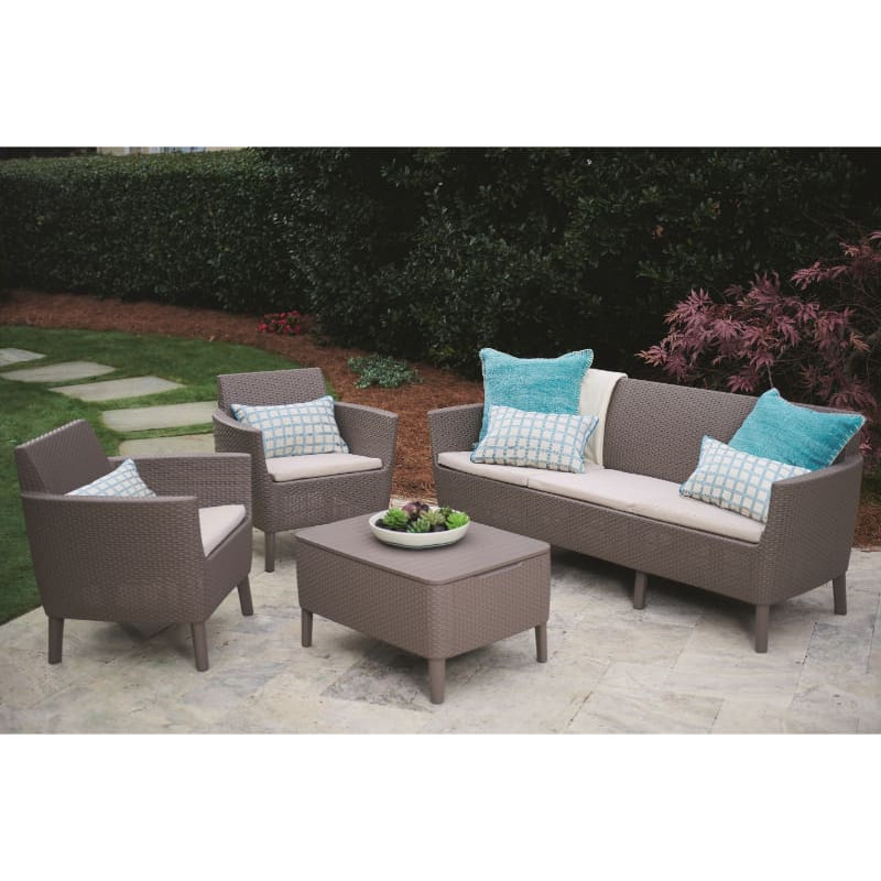 Salemo mēbeļu komplekta galvenās iezīmes ir mūsdienīgs dizains, elegance un ļoti augsts komforts. Komplektā ietilpst plašs, ērts divvietīgs dīvāns, 3 atzveltnes krēsli un galds ar uzglabāšanas funkciju. Mēbelēm ir raksturīga oriģināla tekstūra, kas imitē dabisko rotangpalmu. Komplekts būs ideāls dārza, terases un interjera iekārtošanai. Mēbeles ir viegli montējamas un kopjamas. Izturīgs pret nelabvēlīgiem laika apstākļiem un UV starojumu. Izgatavots no augstas kvalitātes plastmasas. *Mēbeles nav ieteicams izvietot ārtelpās, ja temperatūra ir zemāka par 0°C vai pārsniedz 40 °C