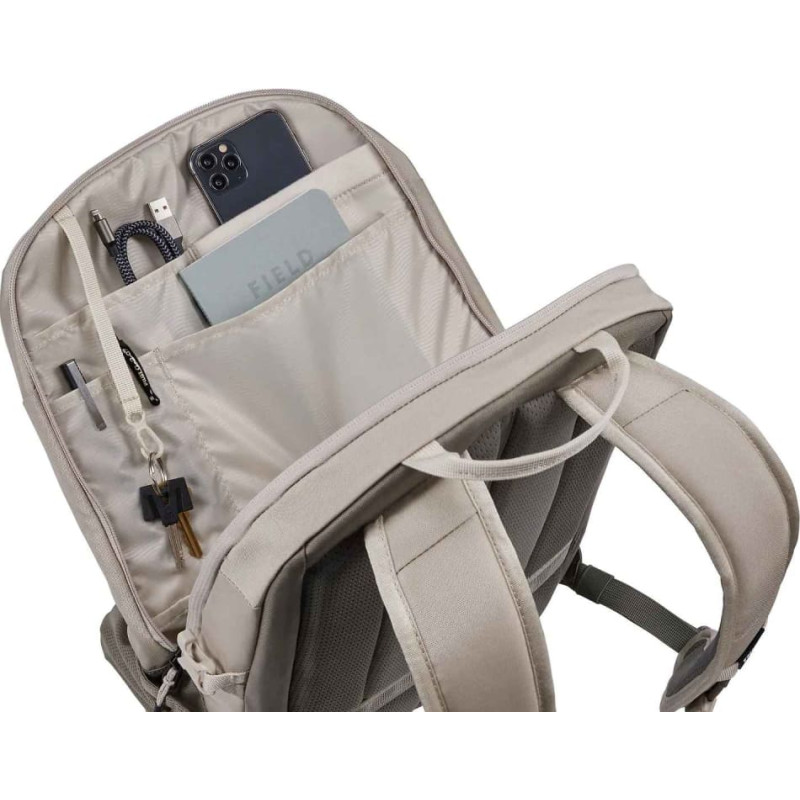 funkcijos Paaukštintos specialios kišenės apsaugo iki 15,6 colio nešiojamąjį kompiuterį ir iki 10,5 colio planšetinį kompiuterį Minkšta kišenė leidžia greitai pasiekti ir saugo telefoną, akinius nuo saulės ar kitus vertingus daiktus Organizacinis skydelis leidžia lengvai pasiekti mažus priedus, rašiklius ir raktus Antriniame skyriuje galima laikyti persirengimo drabužius, aksesuarus ar kitus asmeninius daiktus ir turi užsegamą TPU kišenę, kuri yra atspari vandeniui, kad apsaugotų kitą turinį ir yra nepermatoma, kad būtų užtikrintas privatumas. Tinklinės išorinės šoninės kišenės tampri, kad tilptų vandens butelis, elektrinė plyta ar skėtis Priekinio skydelio blakstienų taškai leidžia lengvai pritvirtinti papildomą įrangą Perėjimo skydelis leidžia pritvirtinti kuprinę prie riedančio bagažo, kad būtų lengviau keliauti Krūtinkaulio dirželis, paminkštinta galinė panelė su oro srauto kanalu ir šoniniai suspaudimo dirželiai apkrovai subalansuoti, kad būtų patogiau nešti Pagaminta iš bluesign® patvirtinto 400D nailono su YKK užtrauktukais Techniniai duomenys Matmenys (P x P x A): 29,0 x 25,0 x 46,0 cm Nešiojamojo kompiuterio skyriaus išmatavimai: 38,5 x 26,5 x 3,1 cm Svoris: 0,91 kg Tūris: 23 L Spalva: Pelican/Vetiver Medžiaga: Bluesign® patvirtintas, 100% 400Dx400D Nylon Oxford paprastas