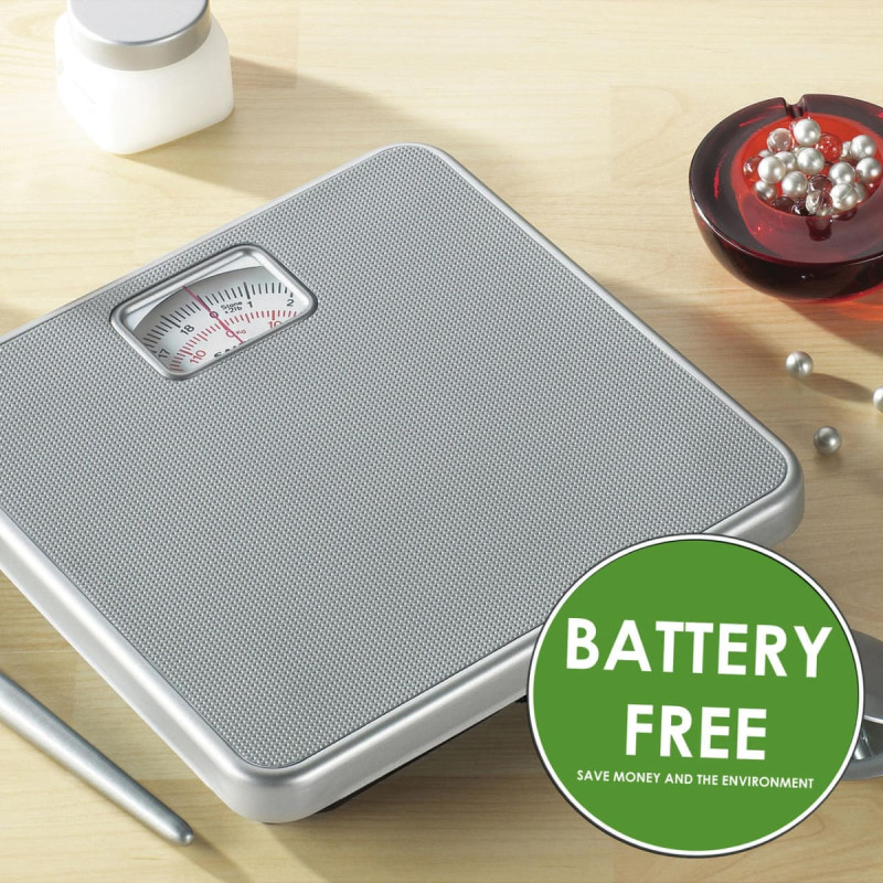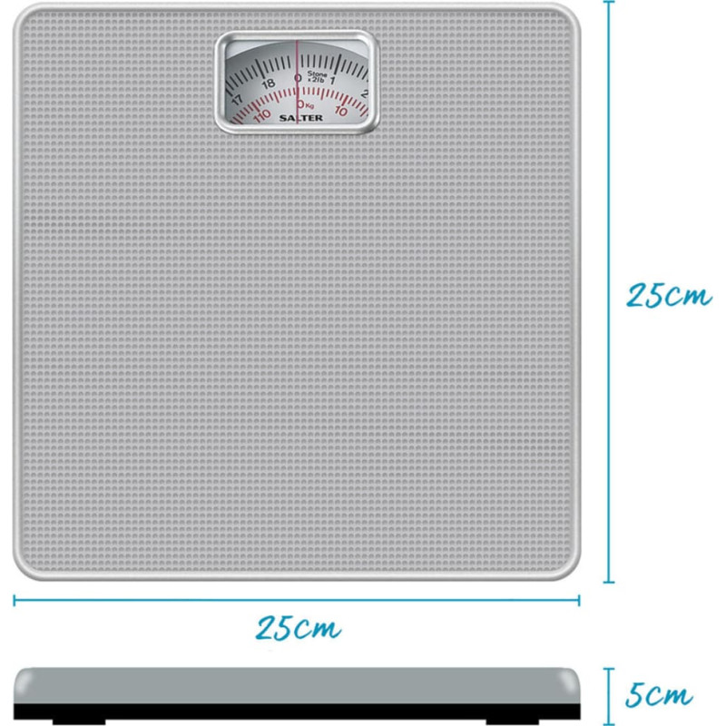 funkcijos Šios naudingos mechaninės Salter svarstyklės su dideliu, lengvai įskaitomu ciferblatu pasižymi imperinėmis ir metrinėmis svarstyklėmis iki 120 kg. Didelė platforma turi neslidų guminį paviršių, užtikrinantį didesnį stabilumą, todėl galite saugiai svertis neslysdami. Dideliame ciferblate yra gerai matomi skaičiai ir raudonas ciferblatas, todėl svorį iš aukščio skaityti yra lengva ir patogu. Naudojant šias vonios svarstykles reikia mažai priežiūros, tiesiog užlipkite ir pamatysite savo svorį, nes nereikia baterijų. Visada įsitikinkite, kad svarstyklės yra ant tvirto lygaus paviršiaus, nustatomos į nulį ir naudojamos tuo pačiu paros metu, kad užtikrintumėte tikslius rezultatus.   Techniniai duomenys Plotis: 4,60 (cm) Aukštis: 25,00 (cm) Gylis: 25,30 (cm) Spalva: Sidabrinė