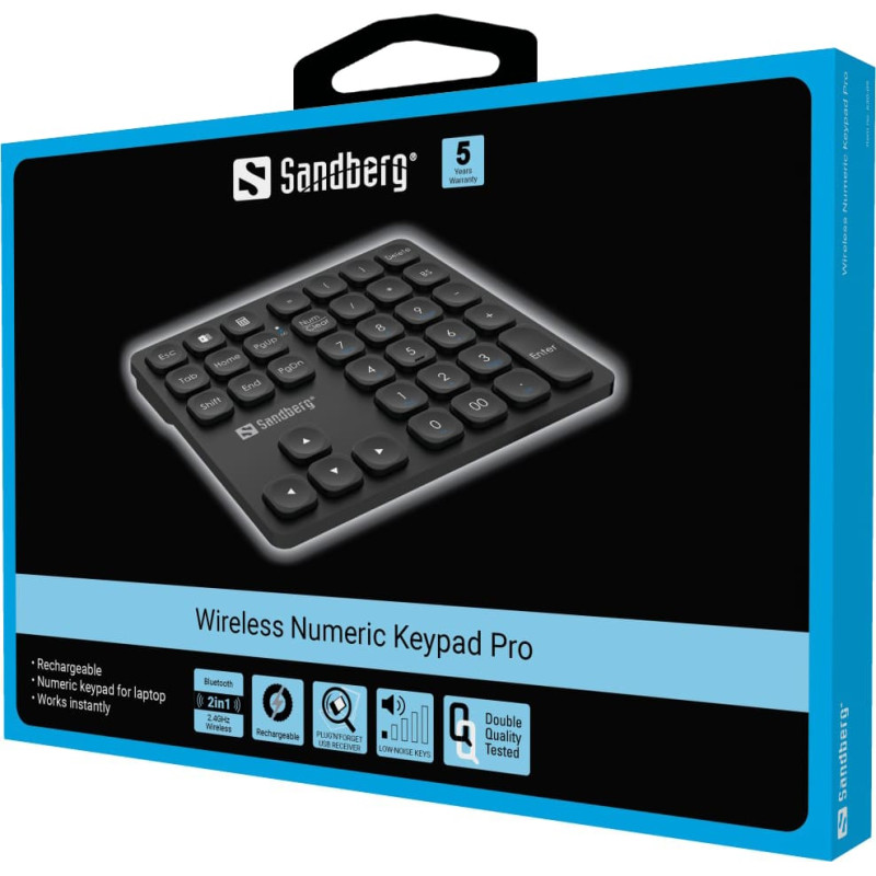 Įkraunamas Skaitmeninė klaviatūra nešiojamam kompiuteriui Veikia iš karto   Techniniai duomenys 2,4 GHz + dvigubas „Bluetooth“ belaidis ryšys Darbinis atstumas: iki 10 metrų Integruota įkraunama baterija Imtuvas: USB sąsaja   Rinkinyje: 1 Sandberg belaidė skaitmeninė klaviatūra 1 USB-A – USB-C įkrovimo laidas 1 USB imtuvas 1 Trumpas vadovas