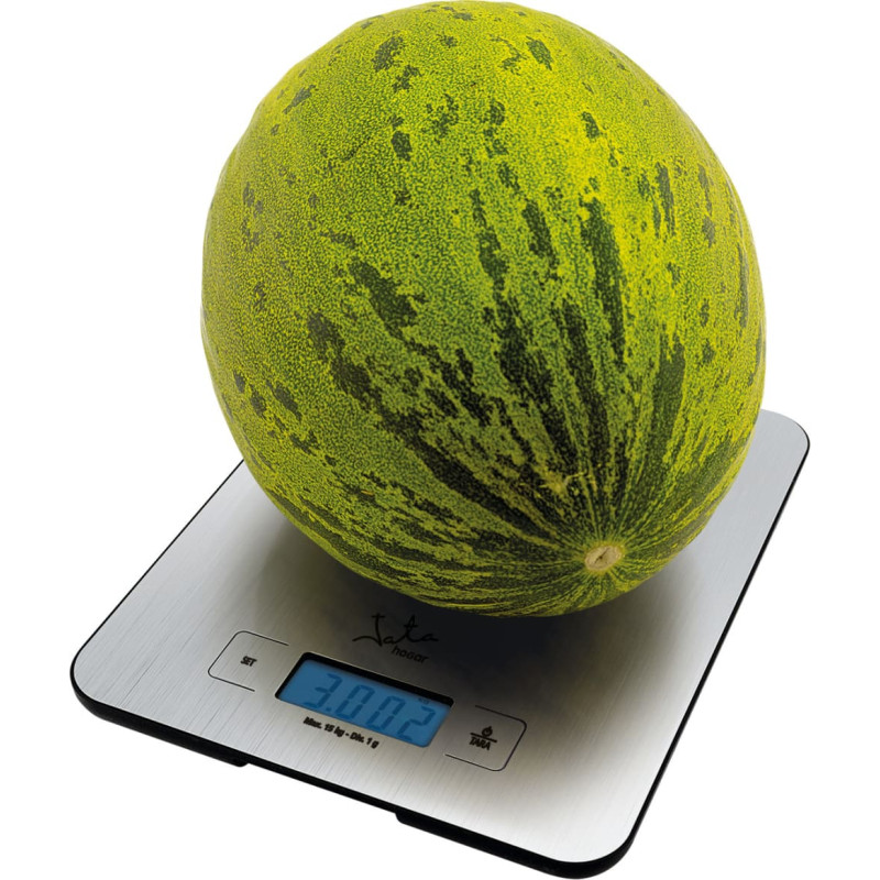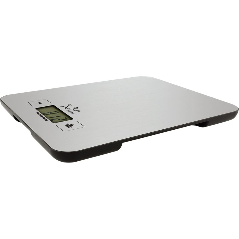 Talpa 15 kg. Baigimas 1 g. Nerūdijančio plieno paviršius. Aukštas elektroninis tikslumas. Galinio apšvietimo „LCD“ ekranas. Laikrodis. Grynoji svorio funkcija. Laikmačio funkcija. Konversijos funkcija: g / kg / oz / lb: oz / fl.oz. Žemas akumuliatoriaus indikatorius. Perkrovos indikatorius. Dirba su 2 „AAA“ baterijomis, 1,5 V (neįtrauktos).