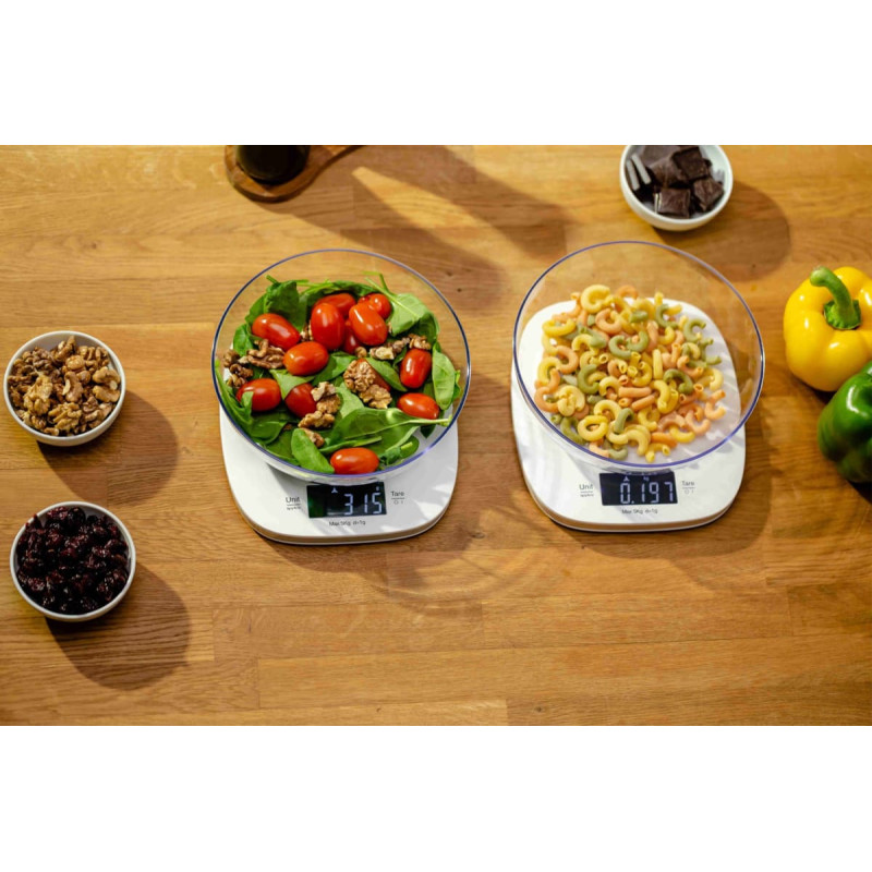 Tipas: Virtuvinės svarstyklės Maksimali apkrova: 5 kg Matavimo diapazonas: nuo 1 g iki 5 kg Matavimo tikslumas: 1 g Ekrano tipas: LCD Matavimo vienetai: g, lb, oz Perkrovos indikatorius: Taip Jutiklinis valdymas: Taip Svarstyklių paviršiaus medžiaga: plastikas Dubuo: Taip Automatinio išjungimo funkcija: Taip