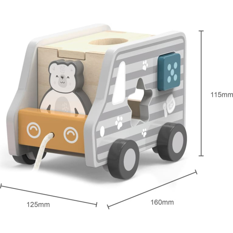 Rotaļlieta ražota no augstas kvalitātes koka. Krāsota ar krāsām, kas ir uz ūdens bāzes, līdz ar to tās ir drošas bērniem un ir bez smaržas.  Rotaļlieta attīsta bērna loģisko un telpisko domāšanu, koordināciju, kā arī runas prasmes.  Rekomendējamais vecums: no 24 mēnešiem.