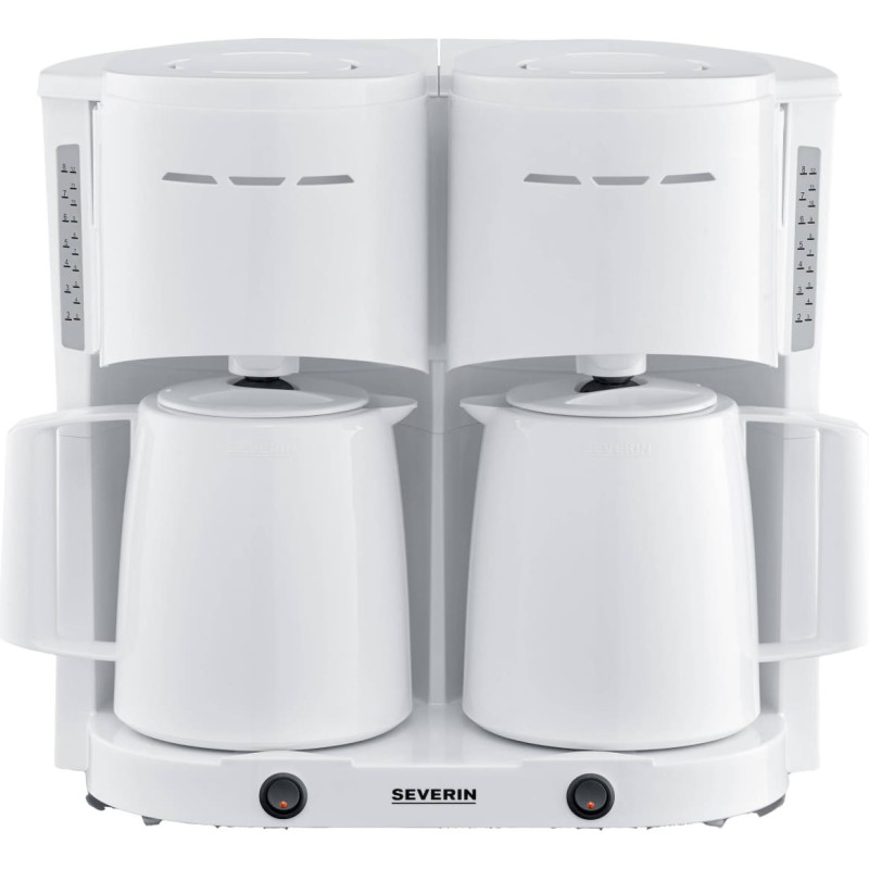 Dvigubas kavos malonumas tuo pačiu metu Vienu metu ruošiami du puodai kavos su 8 puodeliais – puikiai tinka biurams, svečių namams ar restoranams Du terminiai ąsočiai su praktišku užplikymo dangteliu užtikrina ilgalaikį karštos kavos malonumą Du vandens lygio indikatoriai priekyje užtikrina patogų valdymą ir geriausią apžvalgą Integruotas kabelių skyrius, skirtas patogiam laido laikymui   Techniniai duomenys Galia: 2 x 1000 vatų Talpa: 2 x 8 puodeliai Spalva/medžiaga: balta Ypatumai: 2 terminiai ąsočiai su užvirinamais dangteliais, kad būtų galima ilgai laikyti temperatūrą 2 pasukami filtrai 1 x 4 su lašėjimo dangteliu 2 įjungimo/išjungimo mygtukai su indikatorinėmis lemputėmis Kabelio ilgis: 70 cm Automatinis išjungimas: Taip Matmenys: 39,5 x 25,5 x 36,6 cm Svoris: 4,4 kg