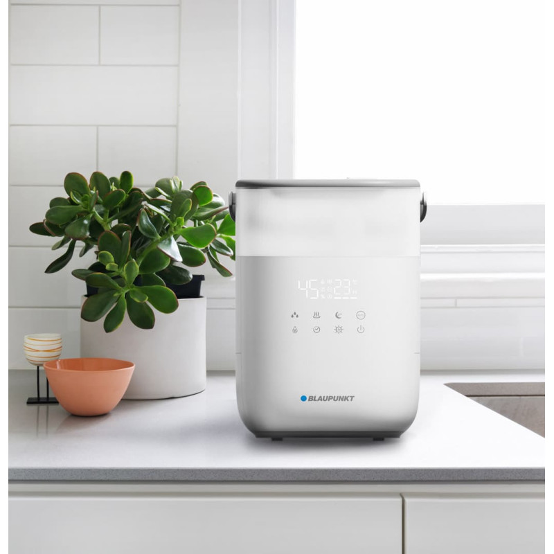 • LED ekranas su jutikliniu valdymo skydeliu • Sterilizavimas oru UV spinduliais • Aromato funkcija, įmontuotas jonizatorius • Nuotolinio valdymo pultas • Reguliuojamas drėkiklis nuo 40-80% • 10 valandų laikmatis • Rūko drėgmės efektyvumas iki 500 ml / h • Demineralizacijos kasetė • Itin tylus veikimas • Keraminio stiklo glazūros keitiklis • Vandens valymas: vandens pašildymas iki beveik 100 ° C, sidabro jonų kasetė • Vandens bako talpa: 6 l • Naktinis režimas • Maitinimo šaltinis 220-240 V ~ 50 Hz, galia: 225 W • Matmenys: 25 x 24,5 x 34,3 cm • Svoris: 2,95 kg