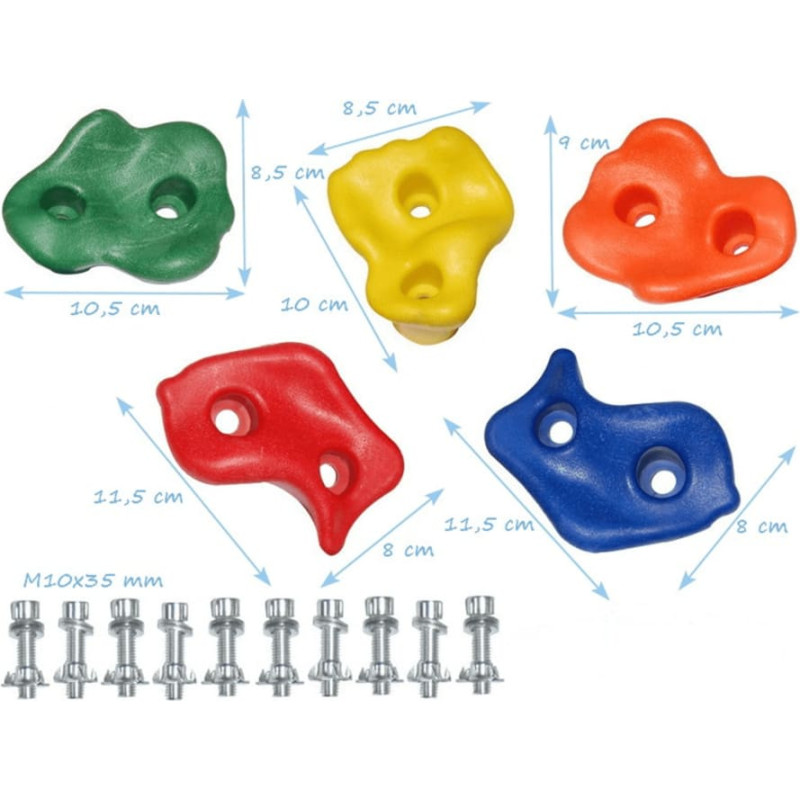 Ar šiem kāpšļiem/turekļiem jūs varēsiet rotaļlaukumā izveidot individuālu un ekskluzīvu kāpšanas vieta vai pat veselu sienu. Ļaujiet bērniem izpriecāties un sasniegt savu mērķi oriģinālā un drošā veidā.