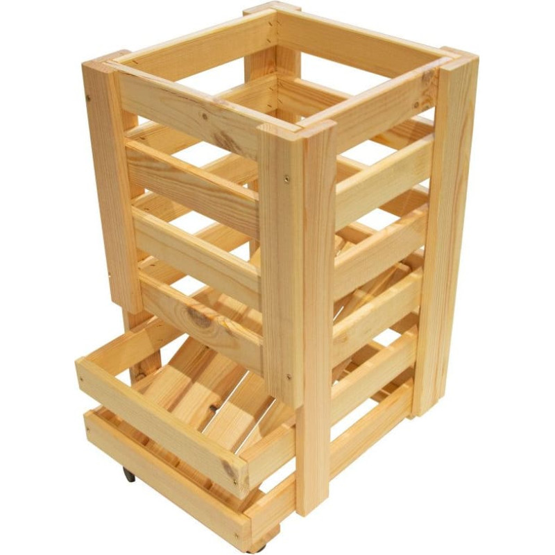 Izturīga koka kaste ir lieliski piemērota dārzeņu vai augļu uzglabāšanai. Slīpā daļa neļauj dārzeņiem palikt pašā kastes apakšā, tos var viegli savākt no apakšas un nav jācenšas aizsniegt kastes apakšu pāri kastes malai. Kaste ir izgatavota no sausas priedes koksnes, kuru varat krāsot, eļļot vai kā citādi dekorēt. Kaste ir ar riteņiem, tādēļ to var ērti pārvietot. Izmēri: 30 x 37 x 51 cm