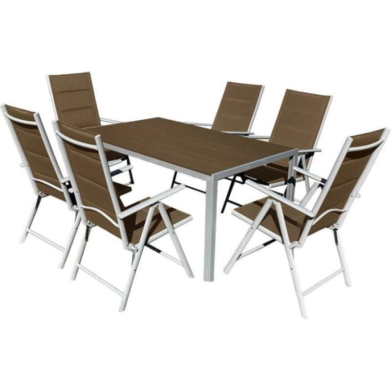 Moderns, izturīgs āra mēbeļu komplekts Harmonija lieliski iederēsies jebkurā mājas interjerā. Šis mēbeļu komplekts uz terases, balkona, lapenē vai jebkur citur palīdzēs sapulcēt visus kopā gan uz ikdienas vakariņām, gan īpašos gadījumos. Universāls, izturīgs, viegli tīrāms un kopjams āra mēbeļu komplekts. Produkts tiek piegādāts nesamontēts un ir viegli uzstādāms. - Galds, 150 x 90 x 72cm - Izturīgs audums, ērti seši krēsli, krēsla izmēri 56 x 65 x 107 cm - Regulējamas krēsla atzveltnes pozīcijas - Krāsa: brūna, pelēka - Materiāls: ar pulverveida krāsu pārklāts alumīnijs, skaidu plāksne - Izturība pret dažādiem laikapstākļiem, UV stariem un rūsu