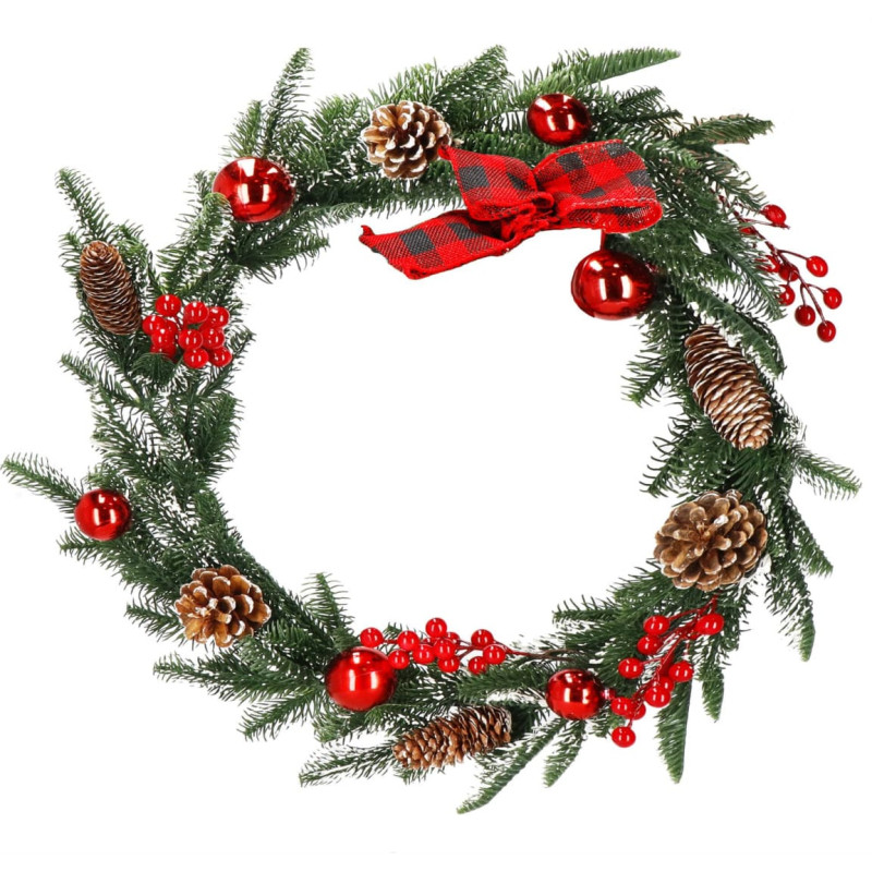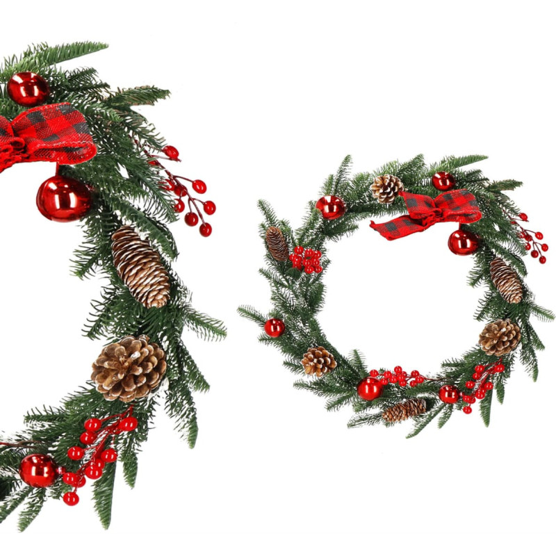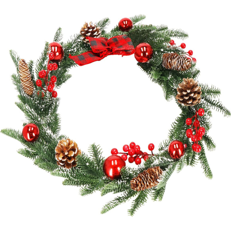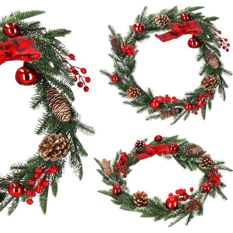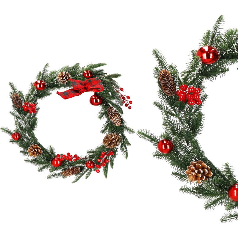 Prekės ženklas: SpringosSpalva: ruda, žalia, raudona, balta, auksinėPlotis: apytiksl. 8 cmGirliavos ilgis: apytiksl. 150 cmMedžiaga: plastikasRaštas: girlianda puošta kankorėžiais, šermukšnio šakelėmis ir raudonais baubais; languotas lankas viename galeVienų skaičius: 1Dirbtinis sniegas ant girliandos