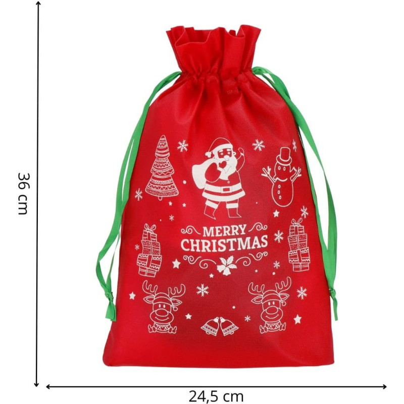 Krāsa: Sarkana / Balta / Zaļa Materiāls: Plastmasa Raksts: sniegpārslas + Ziemassvētku vecītis Kopējais augstums: 36 cm Kopējais platums: 24,5 cm Biezums: 0,5 mm Soma konusveida ar zaļu lenti no divām pusēm Lentes garums aptuveni: 9 cm