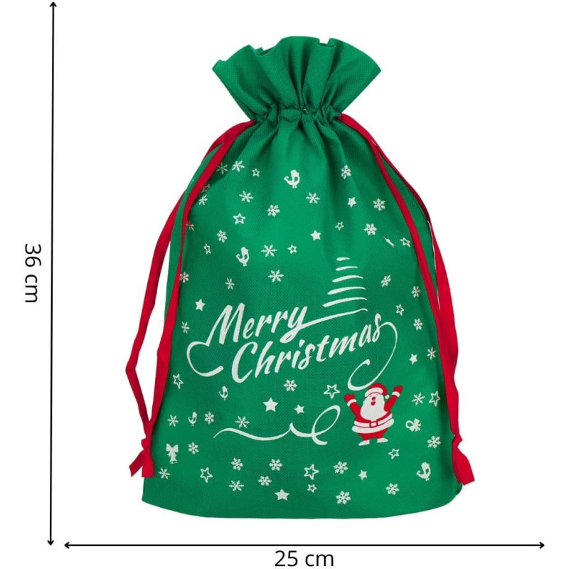 Krāsa: zaļa / balta / sarkana Materiāls: Plastmasa Raksts: sniegpārslas + Ziemassvētku vecītis Kopējais augstums: 36 cm Kopējais platums: 25 cm Biezums: 0,4 mm Soma konusveida ar sarkanu lenti abās pusēs Lentes garums aptuveni: 9 cm