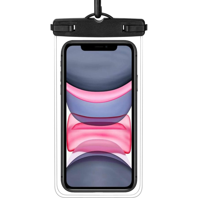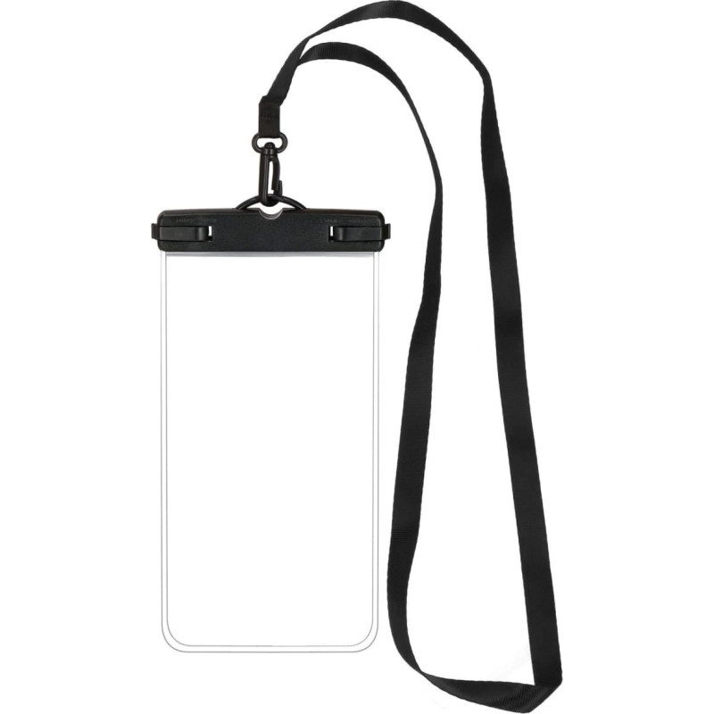Vandeniui atsparus telefono dėklas, skirtas pakabinti ant kaklo. Medžiaga: PVC Korpuso spalva: skaidri Sagties ir dirželio spalva: juoda Bendras aukštis (su dirželio laikikliu): 21,3 cm Bendras plotis: 12 cm Pačio dangtelio matmenys: 18 x 11 cm Lanko/dirželio su užsegimu ilgis: 46 cm Juostos plotis: 1 cm Paskirtis: vandeniui Dvipusis uždarymo užraktas Sagties matmenys: 12 x 2 x 1,5 cm
