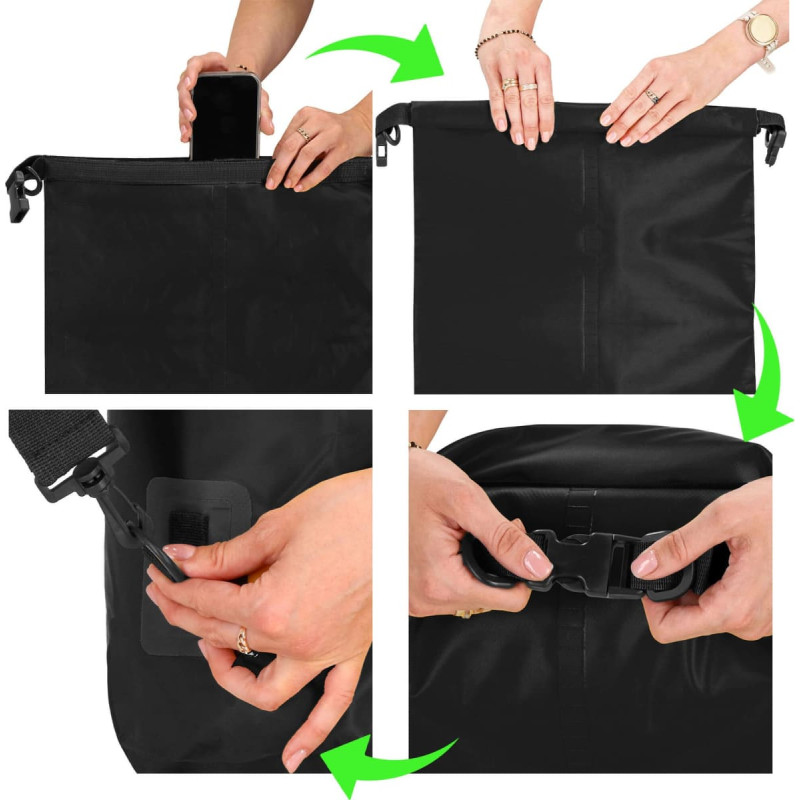 Pagrindiniai duomenys:Tūris: 20LSpalva: juodaMedžiaga: PVCUžsegimas: ritininis Viršutinė + užsegamos sagtysKomplektą sudaro: 2 reguliuojami dirželiai, leidžiantys nešioti kaip kuprinę ar krepšį Matmenys:< /p>Bendras aukštis, matuojamas prieš uždarant: 59 cmPlotis viršuje, matuojamas plokščias: 37 cmApačios skersmuo: 24 cm (šiek tiek smailėjantis į apačią)Storis: apytiksl. 5 mmArmuojančios juostos plotis aplink angą: 25 mmUžtraukiamų sagčių matmenys: 50 x 30 mmPečių dirželių skaičius: 2< /li>Dirželio plotis: 40 mmDirželio ilgio reguliavimo diapazonas (matuojamas be tvirtinimo detalių): 94–58 cm Privalumai:dėl pritvirtintų dirželių galima nešioti kaip krepšį arba kuprinęDydis sulankstytas, priklausomai nuo pagal poreikius ir supakuotų daiktų skaičiųNeperšlampama ir vandeniui atspari medžiagaTalpiNėra skyrių – lengvai telpa didesni daiktai Sulankstytas užima mažai vietosIdealiai tinka vandens sporto entuziastams Atsparus visiems nešvarumams, lengvai plaunamas