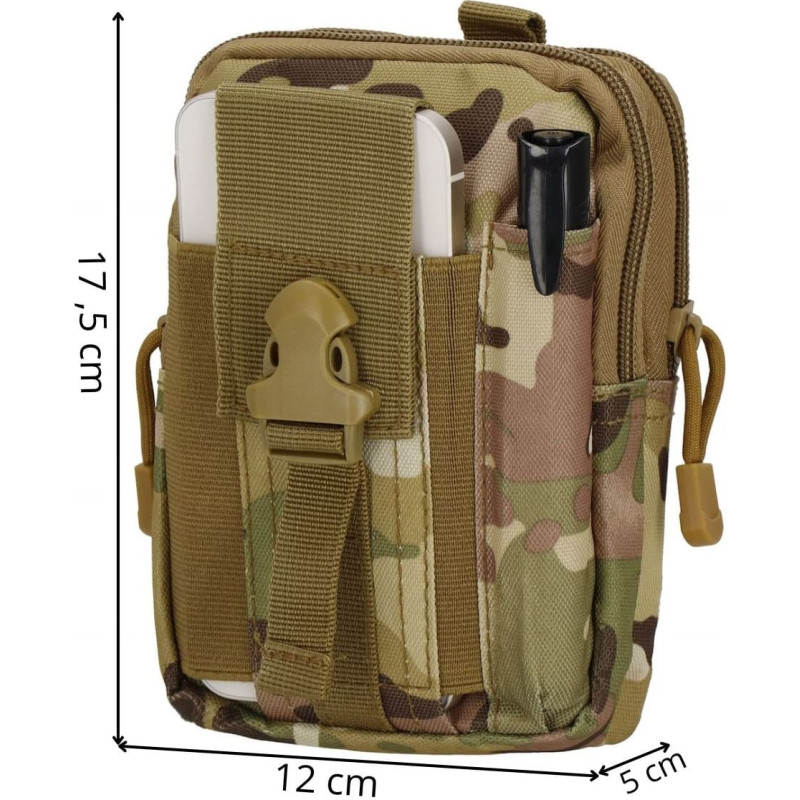 Pagrindiniai duomenys: Prekinis ženklas: Springos® Medžiaga: poliesteris Spalva: Military Green Raštas: kamufliažas Pagrindinis skyrius: 2 Skyrių skaičius: 4 Diržo kilpų skaičius nugaroje: 6 Užsegimo tipas: užtrauktukas Matmenys: Aukštis: 17,5 cm Plotis: 12 cm Gylis: 5 cm Kišenė maišelio priekyje: 12 x 3 cm Guminė kišenė: 11,5 x 8,5 cm Dirželis su kompresiniu užsegimu: 14,5 x 2 cm - viršutinė diržo dalis: 12 x 5 cm Rankenos nugaroje: 13,5 x 2,5 cm (ilgis x plotis) Diržo kilpos nugaroje: 5,5 x 2,5 cm (ilgis x plotis) Tinklo pertvara: 11,5 x 11 cm (ilgis x plotis) Audinio pertvara: 10,5 x 11 cm (ilgis x plotis) Ilgis x Vidinis plotis: 16,5 x 11 cm Papildoma informacija: Reikėtų plauti rankomis Nebalinti Nedžiovinkite džiovyklėje Nelyginkite Nevalyti cheminiu valymu