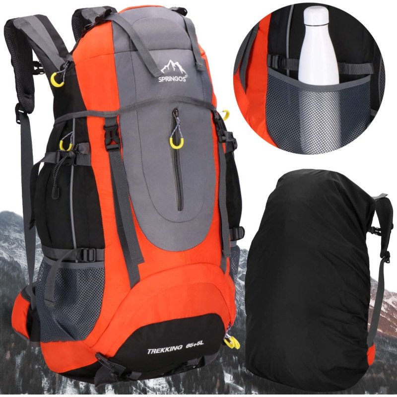 PAGRINDINIAI DUOMENYS Prekinis ženklas: Springos® Spalva: juoda, pilka, oranžinė Medžiaga: išorė - 100% nailonas, vidus - 100% poliesteris Užsegamos sagtys: plastikinės Komplekte uždangalas nuo lietaus Signalo švilpukas: taip Talpa: 65+5 L Kamerų skaičius: 4 Maksimali apkrova: 25 kg Svoris: 1,1 kg Matmenys: 68 x 35 x 20 cm Matmenys: Visas aukštis: 68 cm Visas plotis: 35 cm Bendras gylis: 20 cm Dirželio plotis: apytiksl. 7,5 cm Dirželio ilgis: 43 cm + reguliavimo dirželis (maks. ilgis 40 cm; plotis 2,5 cm) Rankena virš petnešėlių: ilgis 20 cm, plotis 2,5 cm Klubų diržas - šono matmenys, minkšti elementai: 24,5 x 12 cm Klubų diržo reguliavimo dirželiai - plotis: 3,7 cm Bendras klubų diržo ilgis: MIN 59 cm + kuprinės nugaros plotis: 32 cm -> apimtis min. 91 cm; MAX 136 cm -> apimtis max: 168 cm Šoninių tinklinių kišenių matmenys: apytiksl. A 18 x P 19 cm Šoninių kišenių su užtrauktuku išmatavimai: 40 x 6 x 6 cm Kišenių ant klubų diržo išmatavimai: 18 x 10 x 5 cm Pagrindinės kameros kamino aukštis: 12 cm Vidiniai kamerų matmenys: Mažo skyriaus su vertikaliu užtrauktuku matmenys: 30 x 19,5 cm Apatinio skyriaus su arkine spyna matmenys: 28 x 30 cm Viršutiniame atvarte esančio skyriaus matmenys: 22 x 28 x 8 cm Didelio (pagrindinio) skyriaus išmatavimai: 66 x 28 x 14 cm