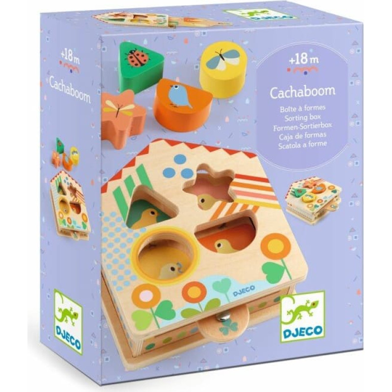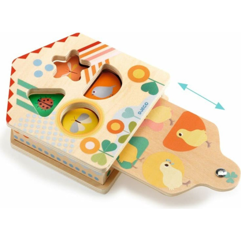 Namo formos medinė rūšiavimo dėžutė. Įstumkite keturias geometrines figūras į atitinkamas skyles. Patraukite už lentos galo ir figūros sukris į dėžutę. Sustūmus lentą, figūros vėl iškyla į viršų ir galite pradėti iš naujo. Rinkinyje yra 1 rūšiavimo dėžutė, 1 medinė lentelė ir 4 geometrinės formos. Žaidimas lavina smulkiąją motoriką, supažindina su formomis ir spalvomis. Rekomenduojamas amžius: nuo 18 mėnesių. Kilmės šalis: K.L.R.