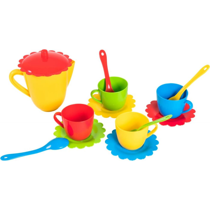 Set of toy tableware consists of 15 elements - bright and stylish tableware. Cups, plates, spoons and a teapot will ensure a wonderful tea party. The toy bowl is made of durable, high-quality and safe food-grade plastic. It can be washed in a dishwasher and heated in a microwave oven. It consists of 15 elements: plates - 5cups - 4spoons - 4kettle - 1cover - 1