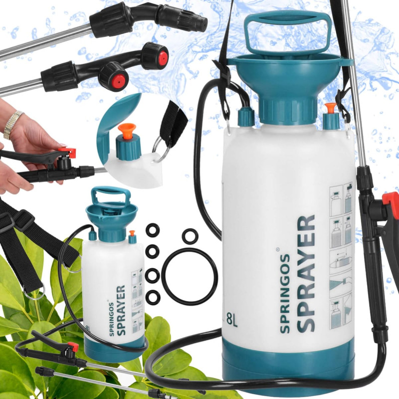 Pagrindinė informacija: Prekinis ženklas: Springos® Spalva: balta, žalia Medžiaga: PP + PE Tipas: slėginis purkštuvas Talpa: 8L Perdangų skaičius: 2 Surinkimo instrukcijos pridedamos Pridedami sandarikliai Matmenys: Bendras aukštis: apytiksl. 56 cm Pagrindo skersmuo: 18 cm Viršutinė žalia dalis: 17 x 9 cm (skersmuo x aukštis) Siurblys: 30 cm - aukštis Siurblio rankena: 11,5 x 2 cm Teleskopinio strypo ilgis: 45-88 cm (min.-maks.) Stiebo ilgis su rankena: 67 - 110 cm (min.-maks.) Lance rankenos ilgis: 14,5 x 2 cm Lance-žarnos jungiamasis elementas: 21,5 x 3 cm Prie purkštuvo pritvirtintos žarnos ilgis: 120 x 1,2 cm Diržai: maks.: 110 cm; tik juodas dirželis, su sidabrine rankena 115 cm Maksimalus diržo tarpas 53 cm Min: 19 cm, su sidabrine rankena 21 cm Purkštuvų patarimai: Dvigubas antgalis su raudonu elementu (mažas): 8 x 5,5 cm (A x P) Vienas antgalis su raudonu elementu: 7 cm Papildoma informacija: Ant rankenos yra raudonas mygtukas, skirtas užrakinti ir atrakinti purškimą. Ant purkštuvo yra iliustruota naudojimo instrukcija. Kadangi puodelio šonuose yra skylės, kur galima pritvirtinti lancetą. Juodas dirželis pritvirtintas prie dviejų angų, esančių abiejose purkštuvo pusėse Oranžinis elementas viršuje: