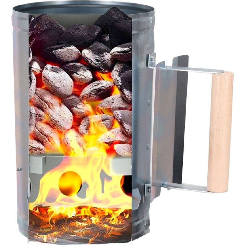 Inovatyvus įrenginys, skirtas lengvam ir greitam briketų uždegimui. Medinė rankena leidžia saugiai nešti šildomą degiklį.   Šis didelis ir praktiškas snukis yra būtinas kiekvienam kepsninės gerbėjui. Grilis degiklis padės greitai ir patogiai uždegti anglį. Tam naudojama kamino formos konstrukcija, kurios dėka optimali oro trauka užtikrina greitą ir tolygų anglių švytėjimą. Nebereikia varginančio pūtimo, vėdinimo, mojavimo ar net naudojimosi džiovintuvu.   funkcijos Anglims ir briketams Optimalus oro tiekimas Greitai užsidega anglis dėl kamino efekto Termoizoliuota rankena, ergonomiškas dizainas Metalinis stovas: 16 cm skersmens Medinė nešiojimo rankena Šilumos skydas nuo atsitiktinio kontakto su karštu paviršiumi Karščiui atsparus plieno lakštas Lengva valyti