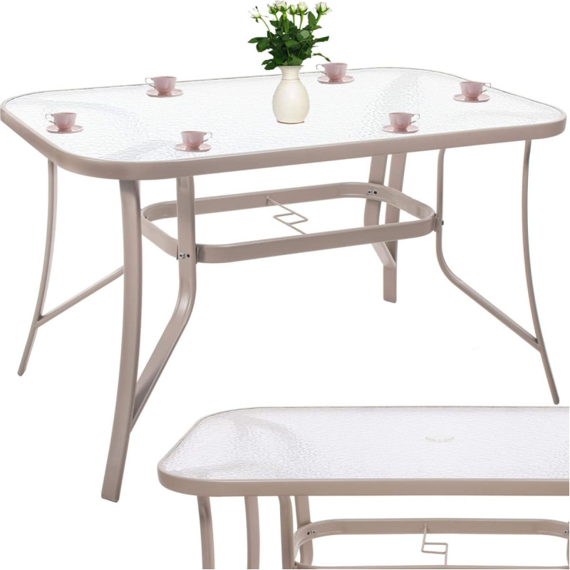 Spalva: pilkas atspalvis Medžiaga: milteliniu būdu dengtas metalas, bespalvis grūdintas stiklas su tekstūra Maksimali apkrova: 100 kg Produktas savarankiškam surinkimui – pridedama instrukcija Matmenys: Visas aukštis: 70 cm Stalviršio ilgis: 120 cm Stalviršio plotis: 70 cm Stalviršio krašto aukštis: 3 cm Konstrukcija ir kojelės pagamintos iš ovalo profilio, matmenys: 42 x 15 mm Atstumas tarp kojų matuojant ant žemės: 110 cm; 62 cm Po stalviršiu stačiakampė konstrukcija suapvalintais kampais, matmenys: 34,5 x 69 cm Stačiakampio viduje yra skėčio stulpo stabilizatorius, pagamintas iš 5 mm storio vielos Stiklo storis: apytiksl. 4 mm Skėčio skylės stalviršyje skersmuo: 4 cm Papildoma informacija: Metalinė konstrukcija padengta antikorozine danga Stalviršyje esanti skylė skėčiui užtvirtinta plastikiniu dangteliu Komplekte montavimo elementai