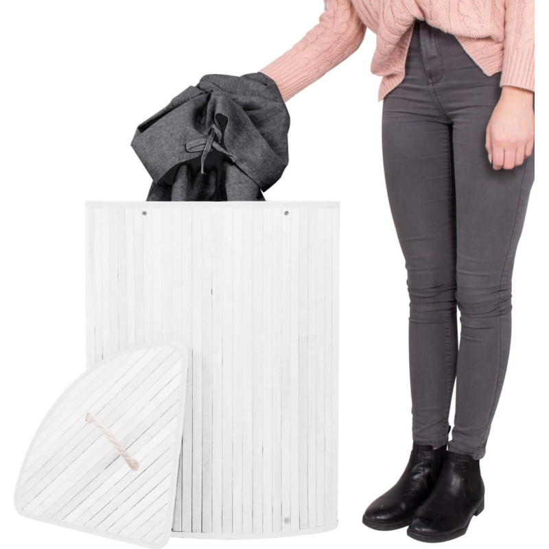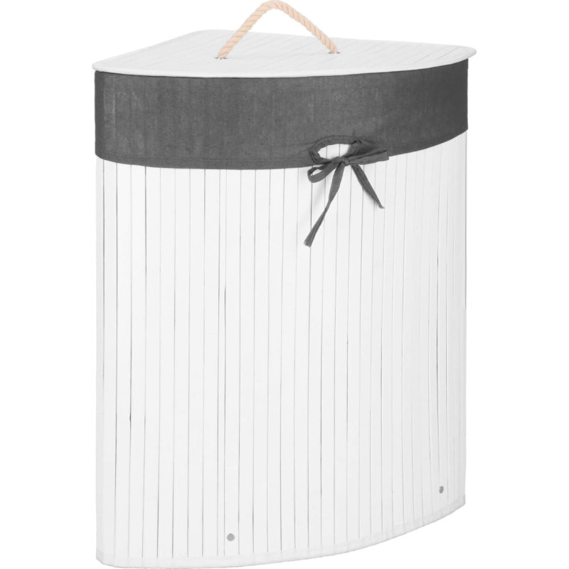 PAGRINDINĖ INFORMACIJA Prekinis ženklas: Springos® Spalva: balta/pilka Medžiaga: bambukas, MDF, audinys, metalas Talpa: 60L Kamerų skaičius: 1 Savarankiško surinkimo gaminys – instrukcijos ant etiketės galo Kampinis krepšelis MATMENYS: Aukštis: 60 cm Plotis: 38 cm Gylis: 38 cm Įstrižainė: 50 cm Virvės rankena: 15 cm Išorinės bambuko plokštės plotis: 18 mm Papildoma informacija: Į komplektaciją įeina elementai (5 vnt.): bambuko korpusas, MDF dugnas, metalinės vielos viršutinės dalies standinimas, medžiaginis vidus, bambuko užvalkalas Uždenkite rankena iš storos virvės Audinio medžiaga: 53% poliesteris, 30% medvilnė, 17% viskozė - galima skalbti rankomis 30°C Nuvalykite drėgna šluoste