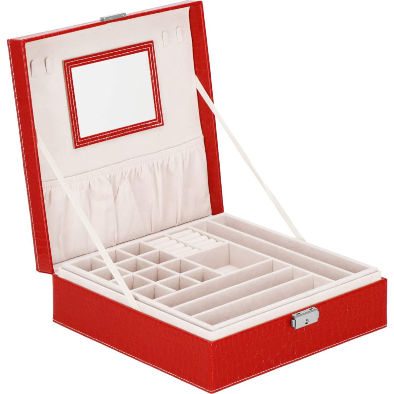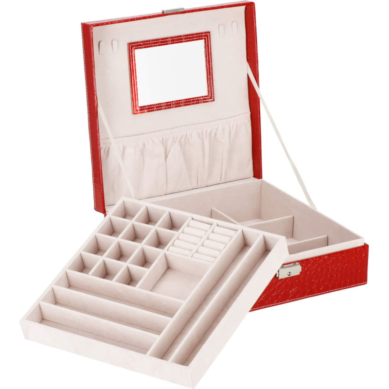 Pagrindinės funkcijos: Kada: Springos® medžiaga: eko oda + zomša + MDF bagažinės spalva: raudona + dekoratyvinė apdaila interjero spalva: šviesiai rožinė zomšinis bagažinės vidus užsegimo tipas: raktas Korpuso viduje: 12x maži skyreliai: 3 x 3 cm 3x skyriai: 17,5 x 2,5 cm 2x skyriai: 23,5 x 2,5 cm 1x skyrius: 6,5 x 6,5 cm 2x žiedo skyrius: 6,5 x 3,5 cm veidrodis: 11 x 8 cm 4x pakabukų kabliukai 1x medžiaginė kišenė: 25 x 9,5 cm 2 lygis: 9x skyriai: 8,5 x 8,5 cm Matmenys: bagažinės plotis: 26 cm aukštis: 8,5 cm gylis; 26 cm