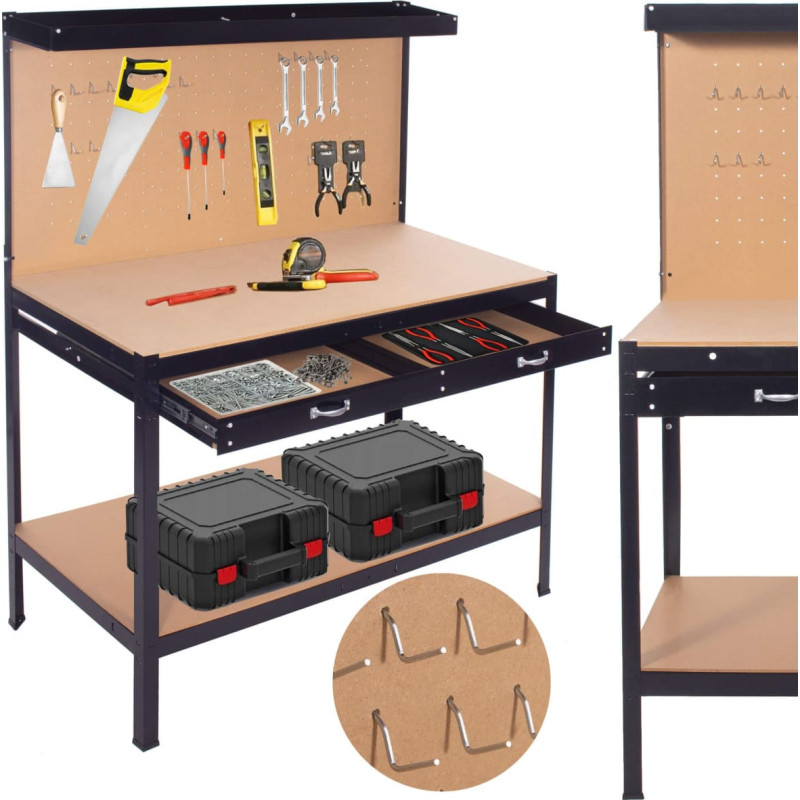 Darbastalis su šiais elementais: stalviršis, stalčius po stalviršiu, apatinė lentyna, viršutinė lentyna, lentyna
