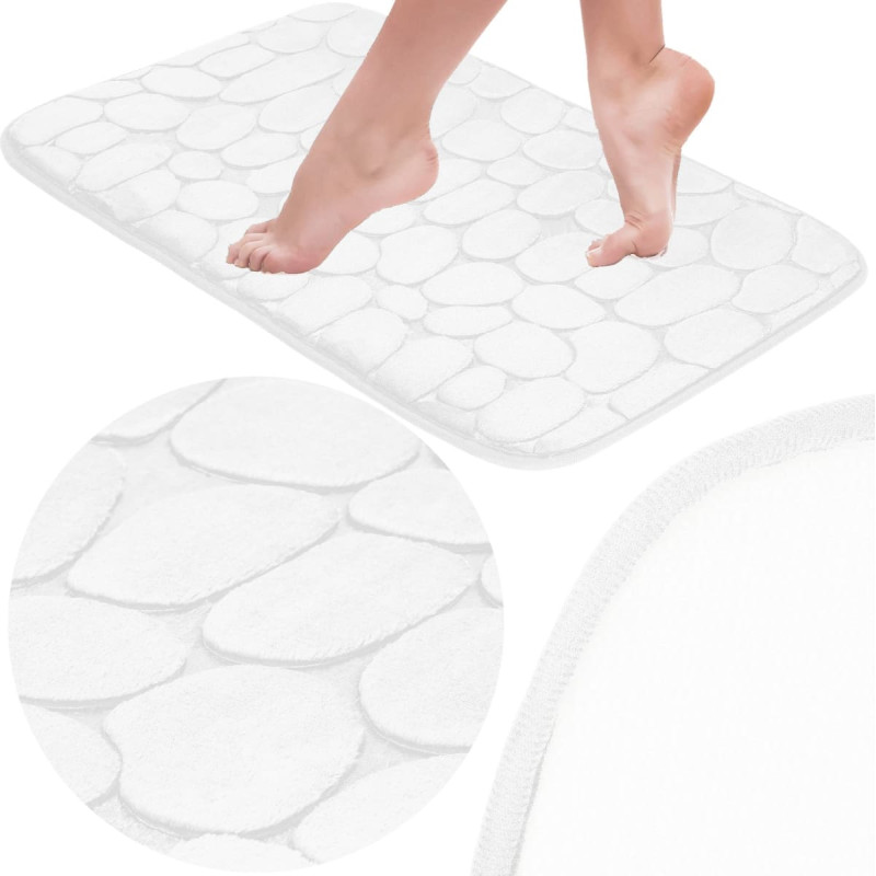 balta spalva Medžiaga: poliesteris Neslysta Greitai džiūstantis Dekoratyvinis įspaudas iš minkšto audinio, primenančio akmenis Matmenys: Visas ilgis: 80 cm Bendras plotis: 50 cm Apytikslis storis: 9 mm Papildoma informacija: Prašome plauti rankomis Nebalinkite ir nechloruokite Nedžiovinkite džiovyklėje Nelyginkite Nevalyti cheminiu valymu