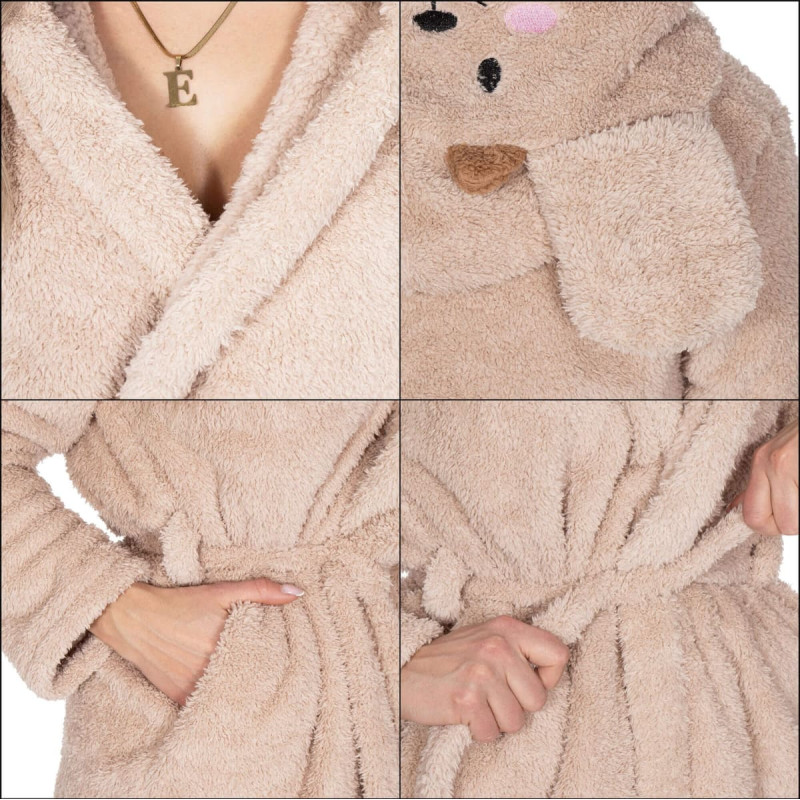 Medžiaga: poliesteris Tekstūra: kailis Spalva: smėlio spalvos atspalvis Dydis: S/M Tankis: 260 g/m2 Privalumai: 2 talpios kišenės, didelis gobtuvas, diržas susirišimui ties juosmeniu, kilpa pakabinimui, ausys su veidu ant gobtuvo Matmenys: Visas ilgis apie 95 cm Plotis po pažastimis apie 61 cm Pečių plotis apie 50 cm Rankovės ilgis apie 59 cm Rankovės plotis apačioje: 14 cm Kapoto ilgis: 30 cm Ausies matmenys: 11,5 x 13 (ilgis x plotis) Papildoma informacija: Skalbti 40°C temperatūroje Nebalinti Nedžiovinkite džiovyklėje Nelyginkite Nevalyti cheminiu valymu