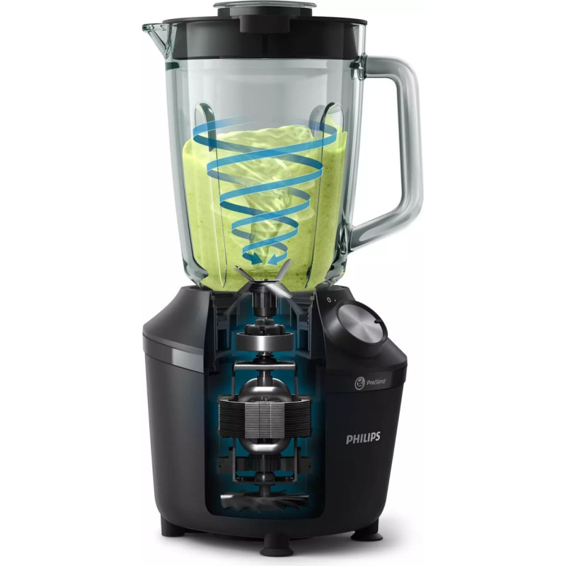 Unikālā ProBlend sistēma nevainojami apvieno 3 tehnoloģijas, kas ir pielāgoti izstrādātas, lai nodrošinātu vienmērīgu rezultātu bez gabaliņiem jau 45 sekunžu laikā*. Motors ar 600 W jaudu virza blendēšanas plūsmu visu sastāvdaļu vienmērīgai cirkulācijai, savukārt inovatīvā lāpstiņu konstrukcija ir izveidota īpašā formā, lai maksimāli palielinātu griešanas laukumu. Ne mazāk svarīga ir krūzes konstrukcija ar unikālām ribām, lai sastāvdaļas pastāvīgi ievirzītu atpakaļ blendēšanas plūsmā