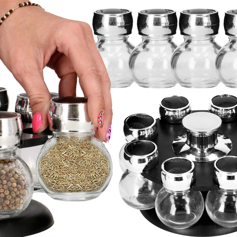 Pagrindinės savybės: medžiaga: plastikas + metalas + stiklas stovo spalva: juoda stiklainio spalva: skaidrus stiklas + metaliniai užsukami dangteliai su juodu elementu pasukamas dizainas 8 prieskonių stiklainiai dviejų funkcijų dozatorius (koštuvas / be koštuvo) sertifikuotas kontaktinis patvirtinimas medžiaga nesugeria kvapų stovo centre yra sidabrinė rankena konstrukcijai pasukti Stiklainio matmenys: p> aukštis: 8 cm plačiausias skersmuo: 6 cm veržlės skersmuo: 4 cm Stovo matmenys: aukštis: 13 cm skersmuo: 23 cm pagrindo skersmuo: 17 cm