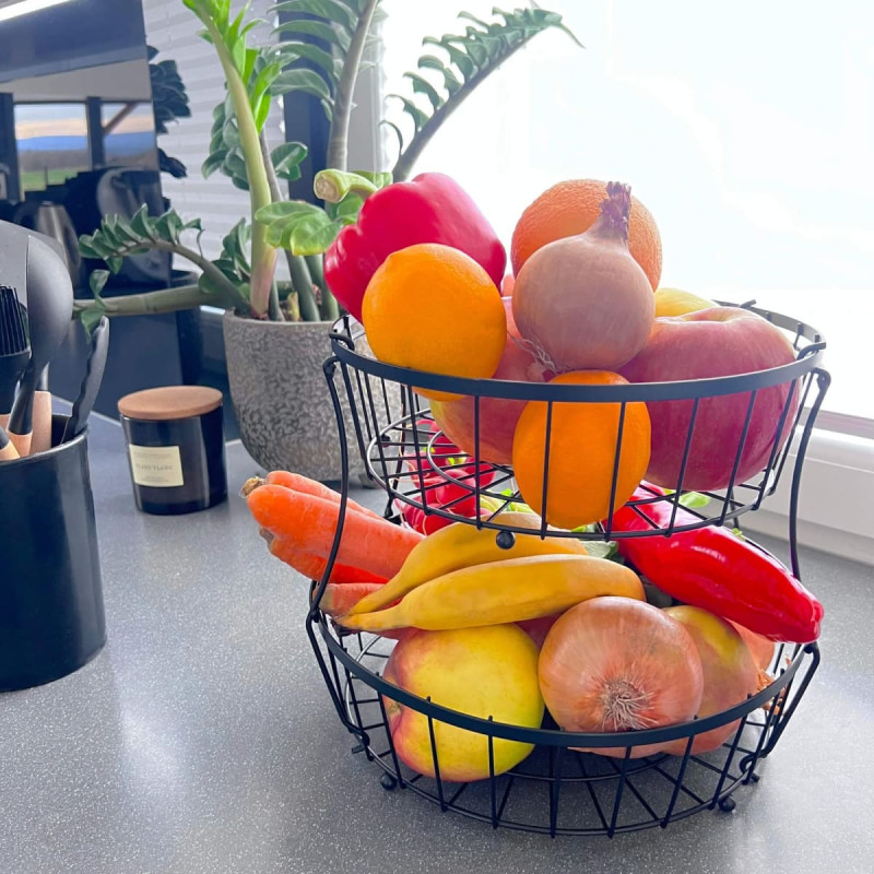 Dubuo yra patrauklus priedas prie stalo Pagaminta iš stiprios medžiagos Padeda palaikyti organizuotumą ir tvarką Palengvina vaisių patiekimą Universalus naudojimas Parametrai: Prekinis ženklas: Springos® Juoda spalva Medžiaga: plienas Sandėliavimo krepšelio lygių skaičius: 2 Elementų skaičius rinkinyje: 4 (2 dubenys, 2 rankenos) Surinkimo instrukcijos pridedamos Matmenys: Visas aukštis: 32,5 cm Didesnio dubens skersmuo: 30 cm Didesnio dubenėlio aukštis: 8 cm Mažesnio dubenėlio skersmuo: 26,5 cm Mažesnio dubenėlio aukštis: 8 cm Bendras plotis: apytiksl. 28 cm 2x laikiklis: 24,5 x 13,5 x 16 cm (I x P siauriausioje vietoje x P plačiausioje vietoje) Krašto storis: 1,5 mm Konstrukcinio vamzdžio storis: 1,6 / 2,3 / 3,3 4 atraminiai rutuliai krepšio apačioje: 9,2 mm (storis) Papildoma informacija: Rankenos su kabliukais patogiam dubenėlių tvirtinimui