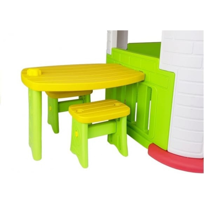 Dārza rotaļu mini- laukums ar mājiņu ir īsta paradīze bērniem. Pateicoties tam, katram mazulim patiks pavadīt laiku dabā, noliekot malā elektroniskos gadžetus. Māja, kas savienota ar galdu, ļaus jūsu bērnam izklaidēties kopā ar brāļiem un māsām, vecākiem vai draugiem. Komplektā ietilpst dārza mājiņa ar plaši atveramām durvīm. Ārpus mājas ir galds ar diviem krēsliem. Komplekts ir izgatavots no augstas kvalitātes HDPE materiāla, pateicoties tam visiem elementiem ir palielināta elastība un tie ir izturīgāki pret mehāniskiem bojājumiem. Izmēri: - visa komplekta augstums: 115 cm - visa komplekta garums: 160 cm - mājas augstums: 115 cm - mājas platums: 100 cm - galda izmēri: 42 cm x 45 cm x 60 cm Komplekta svars: 27,5 kg Iepakojuma izmēri: 113x77x44