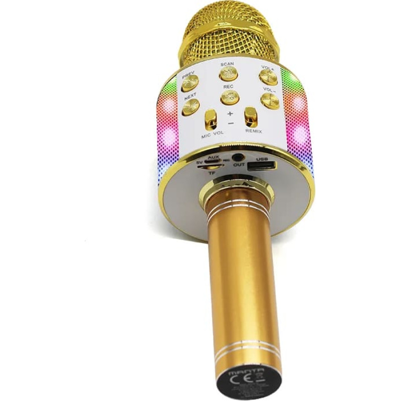 Karaoke mikrofonas su garsiakalbiu MIC20-GL Revoliucinės technologijos leidžia klausytis muzikos ir dainuoti naudojant tik vieną įrenginį. Pristatytas karaoke mikrofonas su garsiakalbiu su 5W išėjimo galia skleidžia aiškų, garsų ir kokybišką garsą. Įrengtas Bluetooth 5.0 technologija, jis taip pat užtikrina sklandų ryšį su išmaniaisiais telefonais, planšetiniais kompiuteriais ir daugeliu kitų belaidžių įrenginių. Pažangios balso moduliacijos ir aido funkcijos garantuos dar daugiau puikių pramogų su artimaisiais.   funkcijos Bluetooth karaokė Integruota baterija Balso moduliacija Groja muziką Aidas   Techniniai duomenys   Išėjimo galia: 5W (RMS) Atkūrimas: MP3 Bluetooth: 5.0 Lizdai: micro SD, AUX-in, Line, USB Suderinamumas: Android ir IOS Maitinimas: 5V DC, Integruota baterija Matmenys: 7,5 x 7,5 x 22 cm Svoris: 240 gr   Komplekte yra: Mikrofonas (aukso spalvos su LED apšvietimu) USB įkrovimo laidas Vartotojo vadovas