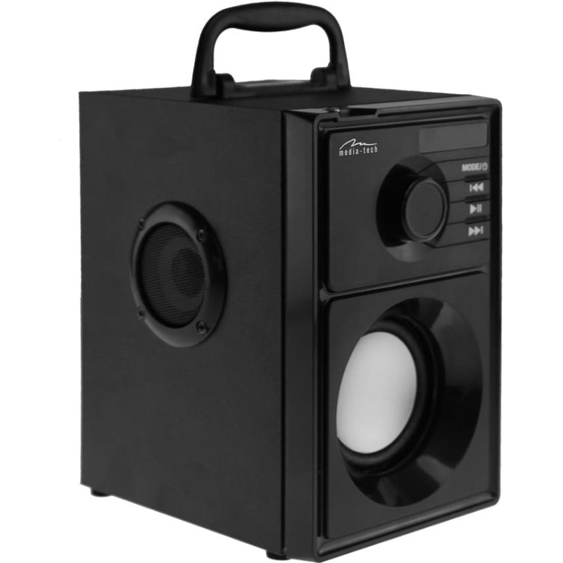 Techniniai duomenys Kompaktiškas stereofoninis Bluetooth garsiakalbis su įmontuotu žemų dažnių garsiakalbiu Bluetooth 5.1+ EDR Protokolai: A2DP, AVRCP FM radijas su automatine stočių paieška 87,6-108MHz Mp3 grotuvas Palaiko micro SD korteles ir USB atminties įrenginius AUX lizdas, ausinės (iš naujo) Nuotolinio valdymo pultas Įkraunama per USB-C 5V prievadą Integruota įkraunama ličio jonų baterija, veikia iki 6 valandų Galia: RMS 15W, PMPO 600W 3 colių žemųjų dažnių garsiakalbis, 2 x 2 colių vidutinio dažnio garsiakalbiai Dažnio atsakas: 80 ~ 20000Hz LED informacijos ekranas Teleskopinė antena Medinis korpusas Matmenys: 12 x 19,5 x 16,5 cm Svoris: 1,220 kg