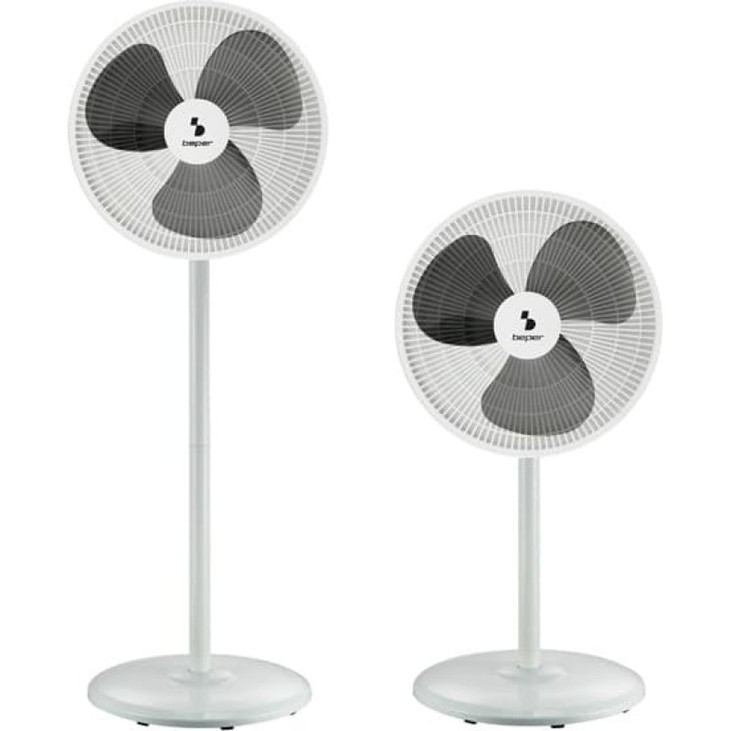 Paprasto ir modernaus dizaino grindų ventiliatorius su dviem padėtyse reguliuojamu aukščiu, kad ventiliatorių iš grindų į stalinį ventiliatorių paverstų per kelias sekundes. 3 didelės mentės ir 3 pasirenkami ventiliatoriaus greičiai geresnei oro cirkuliacijai. Sunkus apvalus pagrindas maksimaliam stabilumui.   Techniniai duomenys Dydis: 38 x 38 x 125 cm Medžiaga: metalas ir ABS Maitinimas: 220-240V, 50Hz Galia: 45W