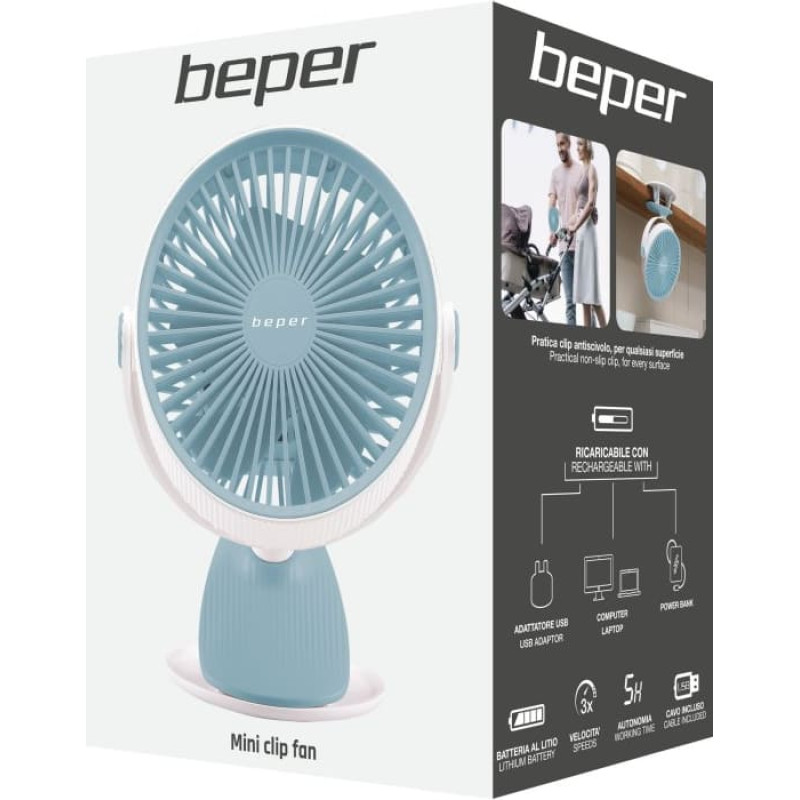 ABS ventiliatorius su 5 mentių mini ventiliatoriumi, apsaugotu Ø 14,5 cm tinkleliu ir praktišku tvirtinimu, kurį galima pritvirtinti prie bet kokio paviršiaus, pavyzdžiui, stalų, lentynų ar vežimėlių. Maitinimas iš tinklo arba įkraunama naudojant pridedamą USB laidą ir ličio bateriją, kuri leidžia įrenginiui autonomiškai veikti iki 5 valandų. LED veikimo indikatorius, 3 pasirenkami greičiai ir reguliuojamas pakreipimas. Idealiai tinka keliui ar paplūdimiui.   Galia: 10W Ličio baterija: 2000 mAh Pakuotės matmenys: 17x12x21 cm Bendras svoris: 1,2 kg