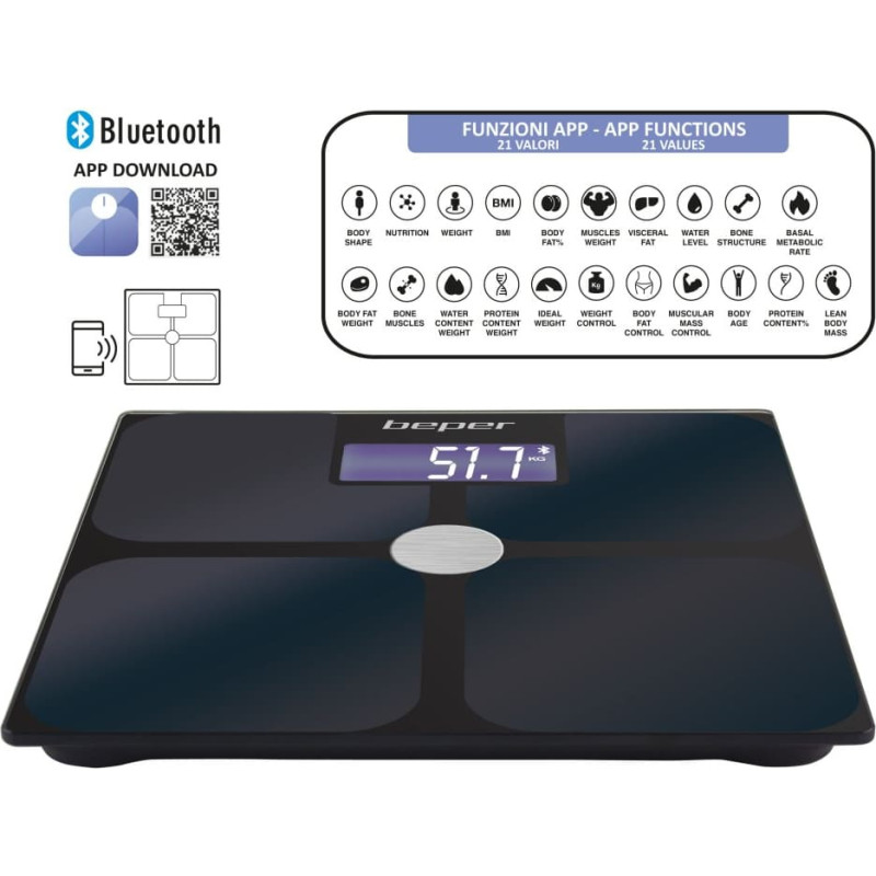 Elektrinės varžos kūno svarstyklės su programėle Elektrinės varžos kūno skalė, matuojanti 21 kūno indikatorių: kūno forma, mityba, svoris, KMI, riebalų masė, raumenų masė, visceraliniai riebalai, vandens lygis, kaulai, bazinė medžiagų apykaita, svoris, riebalų masė, skeleto raumuo, vandens svoris, baltymų svoris, idealus svoris, svorio kontrolė, riebalų kontrolė, raumenų kontrolė, kūno metai, % baltymų, liesa masė. Grūdinto stiklo plokštė yra padengta indžio alavo oksido elektrodais (ITO – indžio alavo oksidas), itin jautriu ir galinčiu greitai bei tiksliai aptikti kūno sudėtį. Integruota „Bluetooth“ technologija, skirta perduoti duomenis tiesiai į išmanųjį telefoną per „Scaleup“ programėlę (galima „iOS“ ir „Android“) ir sinchronizuoti su „Google Fit“, „Fitbit“ ir „Apple Health“ programėlėmis. Istorinių duomenų statistika, surinkta tendencijoms stebėti ir galimybė atsisiųsti duomenis pdf formatu. Keli vartotojai gali kurti profilius visai šeimai ir bendrinti duomenis su bendruomene. Matavimo tikslumas. Jutiklinis uždegimas ir didelis apšviestas LCD ekranas. Perkrovos ir išsikrovusio akumuliatoriaus indikatorius, automatinis išsijungimas. Gaminio dydis: 30 x 30 x 2,5 cm Medžiaga: grūdintas stiklas/ABS Baterijos: 2xAAA (į komplektą neįeina)