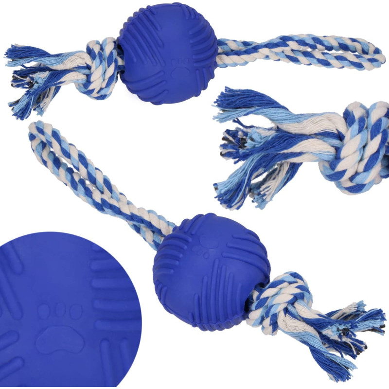 PAGRINDINIAI DUOMENYS Prekinis ženklas: Springos® Spalva: mėlynos ir baltos spalvos atspalviai Medžiaga: TPR, medvilnė Dydis: 25 cm Matmenys: Bendras ilgis: apytiksl. 25 cm Kamuolio skersmuo: 6,5 cm Virvės storis: 0,9 cm Papildoma informacija: Termoplastinio guminio rutulio viduje yra laisvas elementas, kuris purtant skleidžia tuščiavidurį garsą