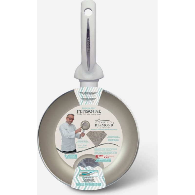 Didelis aliuminio kepimo indas, didelis storis, nesandarus vidinis skaidrus sluoksnis, sustiprintas deimantų milteliais ir nelipiu nepakeičiamu išoriniu sluoksniu, kad būtų užtikrintas geresnis atsparumas įbrėžimams ir trinčiai. Idealiai tinka lengvam ir trapiam kepimui be alyvų ar riebalų. Bakelito minkšta rankena. Patentuotas nerūdijančio plieno dvigubas dugnas su plokščiu paviršiumi, tinkamas visų rūšių kaitlentėms, įskaitant indukciją. Kuris yra labiausiai žinomas natūralus mineralas? Deimantas. Šiuo klausimu gimsta Pensofal MTTP komandos idėja, kad maksimalaus atsparumo savybės taptų nelipniąja danga, realizuojant išskirtinį Diamond®, 9 sluoksnius, sustiprintus deimantų milteliais, be PFOA. „White Diamond®“ kolekcija yra vienintelė pasaulyje, kuri garantuoja maksimalų atsparumą įbrėžimams ir trinčiai, nes deimantai nesuteikia valymo jausmo ant skaidraus paviršiaus. Tiesą sakant, tai yra: INOVACINIS: pirmasis ir vienintelis skaidrus neužklijuotas sluoksnis, sustiprintas natūralių deimantų milteliais, kuris sukuria nuostabų optinį efektą, priklausomai nuo žiūrėjimo kampo; SAUGA: idealiai tinka intensyviam virimui, po panaudojimo nerodo dėmių ir dėmių, garantuojančių maksimalų atsparumą įbrėžimams ir trinčiai; EFEKTYVUS: naujoviškas „Diamond®“ dengimas garantuoja maksimalų nelipimą. Išskirtinė danga yra nelipni, nepakeičiama ir lengvai valoma. Išskirtinis patentuotas dvigubas ir kaltinis dugnas su plokščiu paviršiumi „FULL INDUCTION“, „White Diamond®“ kolekcija tinka visoms kaitlentėms, įskaitant indukciją. Magnetinio nerūdijančio plieno dvigubo dugno padėjimas ant kūno korpuso vyksta įeinant į metalinius antgalius į visos kėbulo korpusą, todėl atskyrimas neįmanomas ir leidžia šilumos vienodumą iš apačios į vidų. Nuolatinių technologinių tyrimų rezultatai rodo, kad mūsų patentuota sistema su platesniu plokščiu kontaktiniu paviršiumi skiriasi nuo įprastų įdubintų dugnų rinkoje ir garantuoja geresnius rezultatus iki 30%, atsižvelgiant į perdavimo ir šilumos greitį. Ergonomiškos ir priešuždegimo rankenos yra pagamintos iš bakelito su minkštu liesti ir chromuotu įdėklu. Karkasas yra 99,5% gryno aliuminio, labai storas, su išskirtine nepaliekančia vidine skaidria danga DIAMOND®, 6 sluoksniai, sustiprinti nekilnojamojo deimantų milteliais. Iš išorinės nelipnos dangos, vario efektas, daugiasluoksnis, nepakeičiamas ir lengvai valomas. Išskirtinis patentuotas nerūdijančio plieno dvigubas ir kaltinis dugnas su plokščiu paviršiumi "FULL INDUCTION" Skersmuo: 24 cm Matmenys: 5 x 43 cm Svoris: 0,77 kg Talpa: 1,55 L Apatinis skersmuo: 15,5 cm