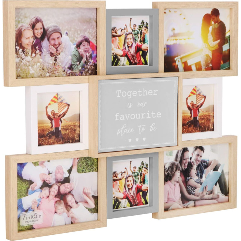 Spalva: medžio imitacija, balta, pilka Medžiaga: MDF, plastikas Nuotraukų lizdų skaičius: 8 Montavimas: horizontalus Matmenys: Visas ilgis: 51 cm Bendras plotis: 37,5 / 40,5 cm Krašto storis: 2 cm 4x rėmas: 19,5 x 14,5 cm (ilgis x plotis) 4x rėmas: 11,5 x 11,5 cm (ilgis x plotis) Lango dydis: 4x: 17 x 11,9 cm / 4x: 9 x 9 cm / 1x: 18 x 12,9 cm Nuotraukos dydis: 17,8 x 12,8 cm (ilgis x plotis) / 10 x 10 cm Kabliukai pakabinimui: 1,5 x 1 cm