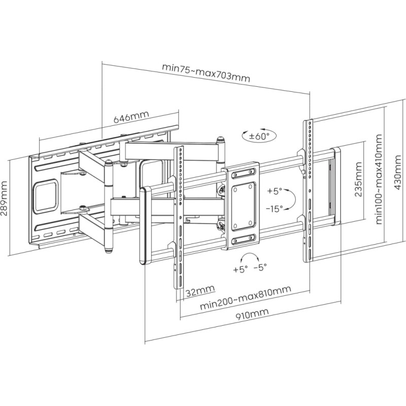 Techniniai duomenys Tvirtinimo tipas: pakreipiamas – pasukamas ranka Mažiausias VESA: 200 x 200 Didžiausia VESA: 800 x 400 Maksimali apkrova (kg): 120 Minimalus ekrano dydis: 43'' / 109 cm Maksimalus ekrano dydis: 100'' / 254 cm Minimalus atstumas nuo sienos (mm): 75 Maksimalus atstumas nuo sienos (mm): 703 Vertikalus pakreipimas: +5°/ -15° Pasukimas: +60°/ -60° Lygio reguliavimas: +5°/ -5° Lygis: Taip Išlenktiems ekranams: Taip Kabelių valdymas: Taip Nuimama VESA plokštė: Taip Montavimas: siena Spalva: juoda Medžiaga: Plienas Paviršiaus apdaila: Miltelinis dažymas Matmenys (mm): 703x910x430 Pastaba: Montuodami atkreipkite dėmesį į VESA ir atskirų televizorių gamintojų naudojamų varžtų tipą!