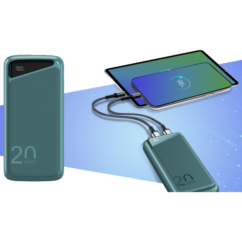 Techniniai duomenys Talpa: 20000mAh, 3,7V 74Wh Taškinės matricos ekranas Lengvas svoris Visiems įrenginiams Apsauga nuo perkrovimo Dviejų krypčių USB-C prievadas: įvesties / išvesties USB-C prievadas 2 USB-A prievadai Mikro-USB įvesties prievadas
