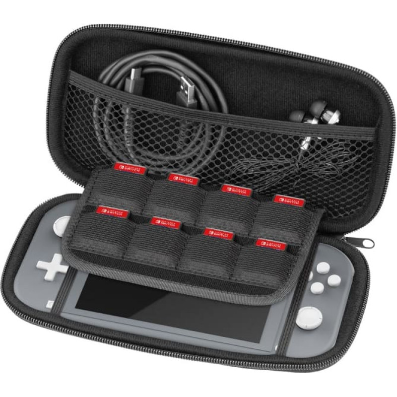 Jungiklio apsauginis dangtelis XL dydžio nešiojimo dėklas, skirtas saugiai laikyti ir transportuoti Nintendo Switch Lite konsolę ir jos priedus.   funkcijos Putplasčio pamušalas ir vidinis atvartas apsaugo konsolę ir priedus nuo smūgių ir įbrėžimų. Leidžia laikyti konsolę ir priedus, pvz., žaidimų ausines ir 4 žaidimų kasetes... Lengvas ir praktiškas transportavimas: su rankena, elastinėmis juostelėmis konsolei ir tinkleliu priedams bei žaidimams. Šis dėklas buvo specialiai sukurtas Nintendo Switch Lite, kad galėtumėte saugiai nešiotis jūsų konsolę ir priedus.