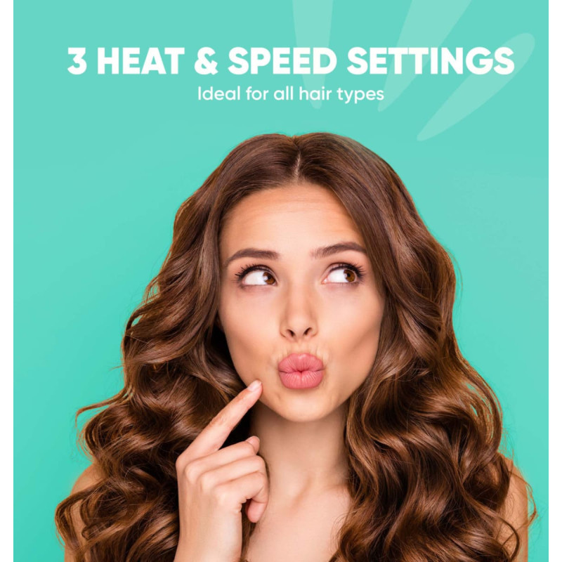 funkcijos 1200 W 4-in-1 daugiafunkcinis air styler 2 keičiamos šepetėlio galvutės Lankstūs ir lankstūs šereliai 3 šilumos/greičio nustatymai Keraminė statinė su makadamijos ir argano super blizgesio aliejais Tinka visų tipų plaukams 2 metrų besisukantis laidas Svoris: 629g