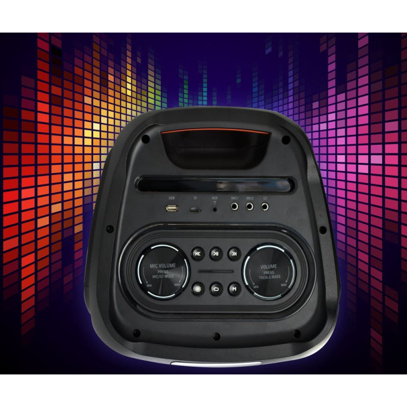 Galia: 300W didžiausia Maitinimas: AC 100-240V 50/60Hz Atkūrimas: MP3, WAV, WMA Ryšys: Bluetooth 5.0, GRP Jungtys: AUX, gitara, mikrofonas, microSD, USB Dažnio atsakas: 40-20 000 Hz Maks. baterijos veikimo laikas: 3 valandos Matmenys (P x A x G): 37 x 37 xx 87 cm Svoris: 15,20 kg
